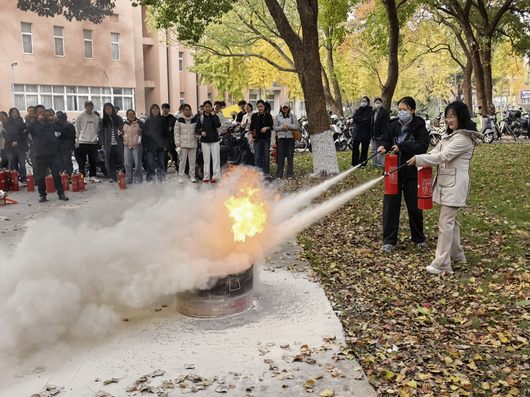 疏散到安全场地之后,师生们认真聆听学校平安办工作人员讲解过滤式消防自救呼吸器和灭火器的使用方法,并实际操作。